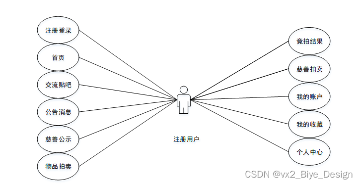 用户进入系统可以进行首页、交流贴吧、公告消息、慈善公示、物品拍卖、慈善拍卖、竞拍结果、我的(我的账户、我的收藏、个人中心)等。注册用户用例如图3-8所示。