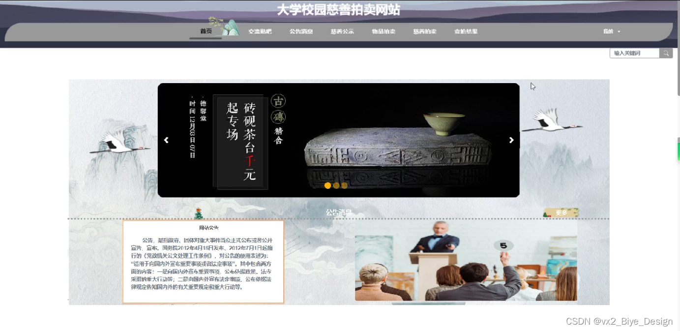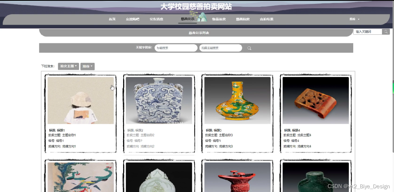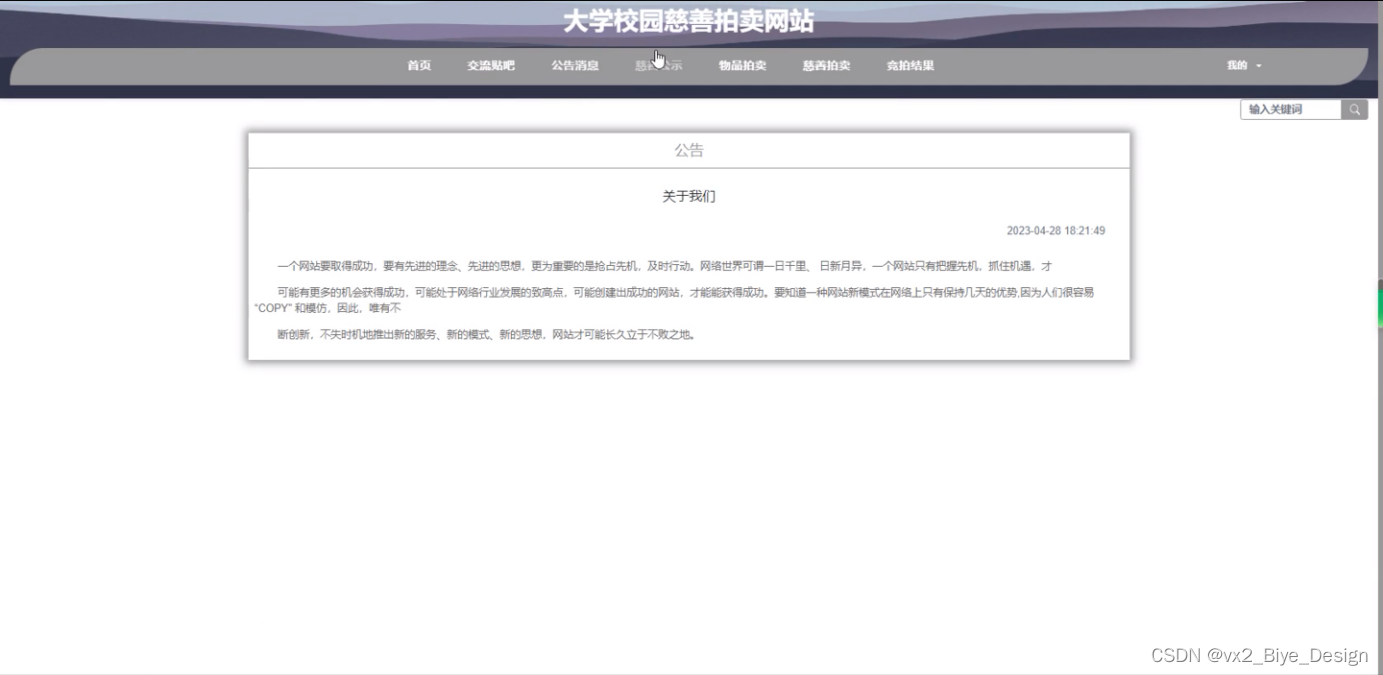 The main functional modules of the university campus charity auction website include user management, rotation chart, announcement message management, communication management, theme classification, charity publicity, item auction, item auction, charity auction, charity auction, donation of items, auction results, etc. The software development and hardware installation adopt a object-oriented development model, which can well meet the actual needs of use, We have improved the corresponding software installation and program coding work, using MySQL as the main storage unit for backend data, and using SSM framework, JAVA technology, and Ajax technology for business system coding and development, achieving all the functions of this system. This report first analyzes the background, role, and significance of the research, laying the foundation for the rationality of the research work. Analyze the various requirements and technical issues of the university campus charity auction website, prove the necessity and technical feasibility of the system, and then provide a basic introduction to the technical software and design ideas required for designing the system. Finally, implement the university campus charity auction website and deploy and operate it.