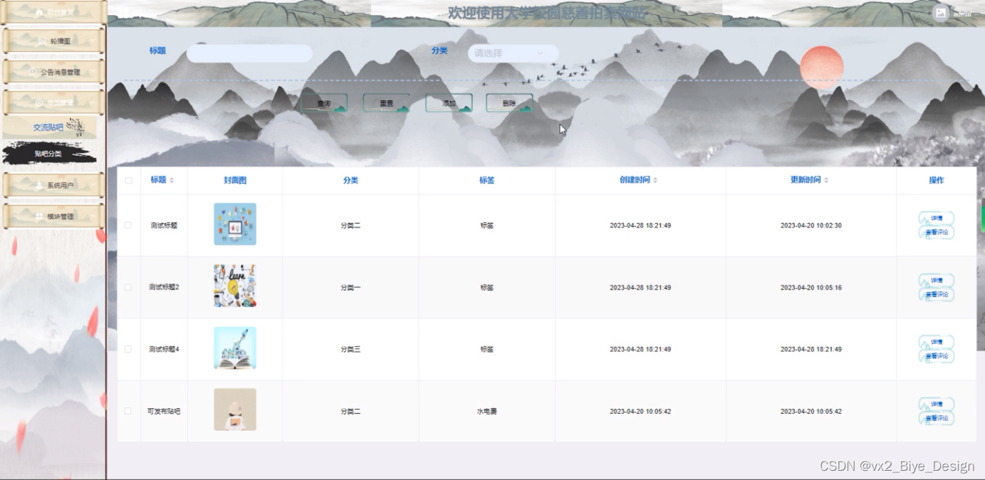 交流管理,在交流管理页面中可以对交流贴吧以及贴吧所属分类进行维护管理,并可根据详情进行修改、添加、或删除等详细操作,如图5-16所示。