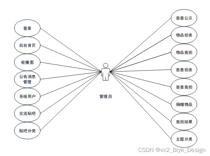 系统中的核心用户是系统管理员,管理员登录后,通过管理员菜单来管理后台系统。主要功能有后台首页、系统用户(管理员、系统用户)、轮播图、公告消息管理、交流管理(交流贴吧、贴吧分类)、模块管理(主题分类、慈善公示、物品拍卖、物品竞拍、慈善拍卖、慈善竞拍、捐赠物品、竞拍结果)等功能模块。管理员用例如图3-7所示。