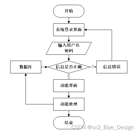 用户打开并进入系统后,会先显示登录界面,输入正确的用户名和密码,系统自动检测信息,若信息无误,则用户会进入系统功能界面,进行操作,否则会提示错误无法登录,操作流程如图3-3所示。