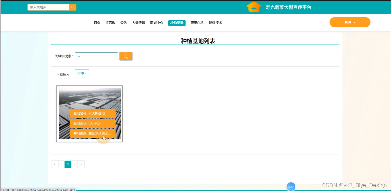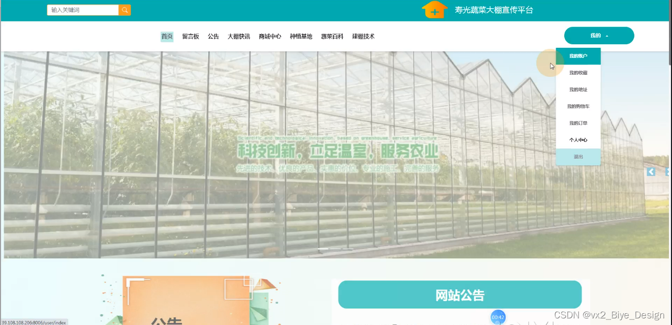 用户可以实现:首页、留言板、大棚快讯、商城中心、种植基地、蔬菜百科、建棚技术、我的等。