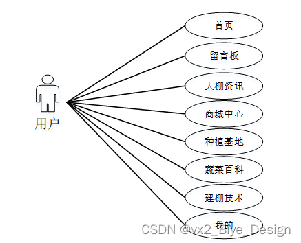 用户注册登录后可进行:首页、留言板、大棚快讯、商城中心、种植基地、蔬菜百科、建棚技术、我的管理,用户用例如图3-2所示。