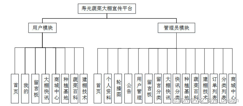 这些功能可以充分满足寿光蔬菜大棚宣传平台 的需求。此系统功能较为全面如下图系统功能结构如图4-3所示。