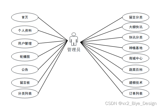管理员登录后可进行首页、个人资料(个人信息、修改密码)、公共管理(轮播图、公告)、用户管理(管理员、系统用户)、信息管理(留言板、留言分类、大棚快讯、快讯分类)、种植基地、蔬菜百科、建棚技术、订单列表、分类列表、商城中心管理,管理员用例如图3-1所示。
