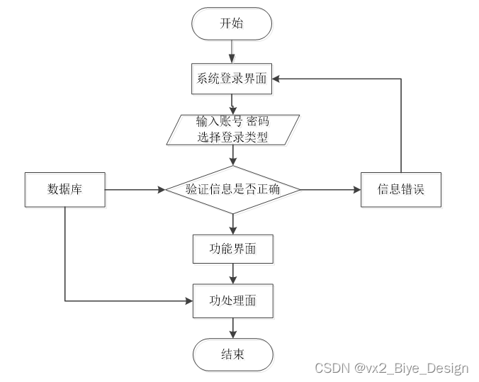 用户想进入系统,首先进入系统登录界面,通过正确的用户名、密码,选择登录类型登录,系统会检查登录信息,信息正确,然后输入相应的功能界面,提示信息错误,登录失败。系统操作流程如图3-4所示。