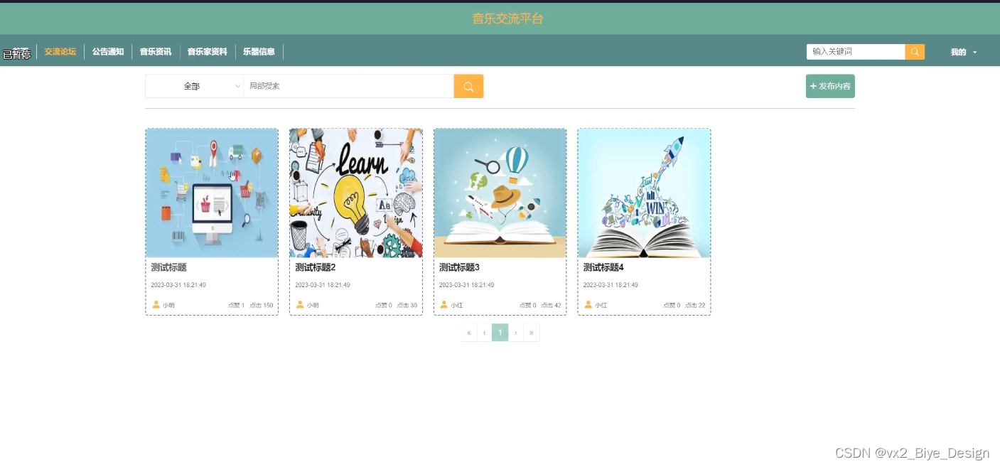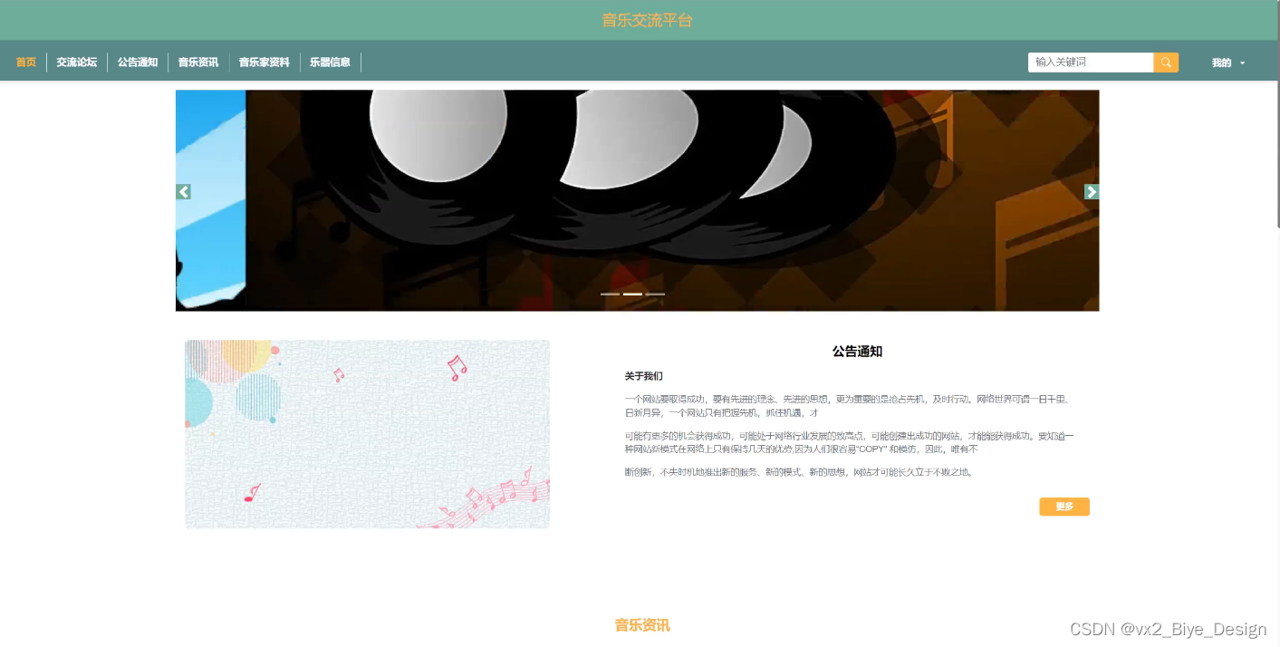 当进入音乐交流平台的时候,首先映入眼帘的是系统的导航栏、轮播图以及公告通知、音乐资讯,同时可以输入关键词对音乐交流平台的内容进行检索,右上角是用户登录以及注册按钮,其主界面展示如下图4.1所示。