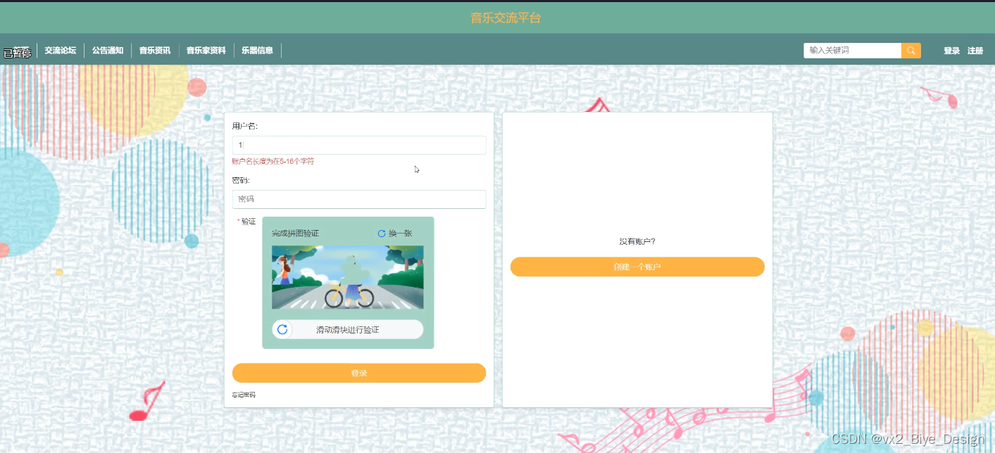 音乐交流平台中的前台上注册后的用户是可以通过自己的username和password进行登录的,当用户输入完整的自己的username和password信息并点击“登录”按钮后,将会首先验证输入的有没有空数据,再次验证输入的username和password在数据库中当前保存的用户信息是否一致,只有在一致后将会登录成功并自动跳转到音乐交流平台的首页中;否则将会提示相应错误信息,登录界面如下图4.3所示。