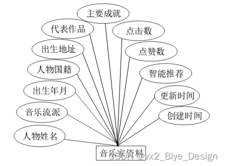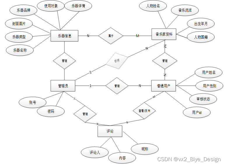 音乐交流平台的E-R图主要是根据普通用户以及管理员的实际需求设计的,用户注册以后可以查看乐器信息,只有注册登录以后才可以进行音乐家资料查询;管理员对整个系统的评论、交流论坛等进行综合管理。音乐交流平台采用的是MYSQL的数据库进行存储的,数据库里面储存了很多的表信息,在此罗列出来一些主要的数据库E-R模型图。