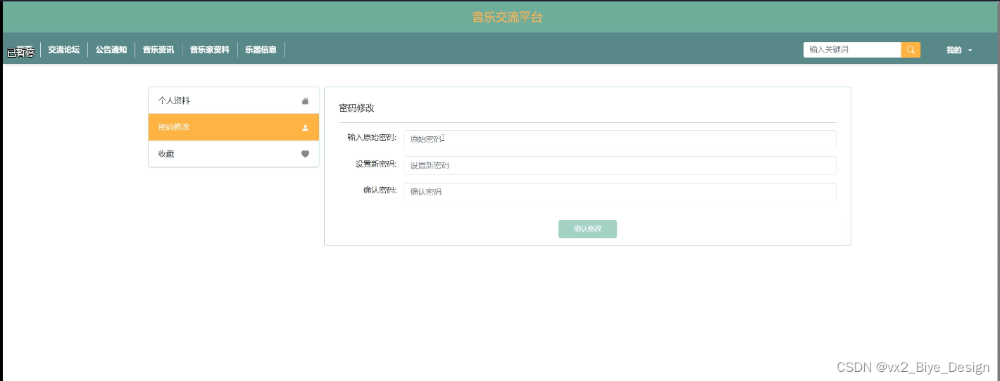 用户使用该音乐交流平台注册完成后,用户对登录密码有修改需求时,系统也可以提供用户修改密码权限。系统中所有的操作者能够变更自己的密码信息,执行该功能首先必须要登入系统,然后选择密码变更选项以后在给定的文本框中填写初始密码和新密码来完成修改密码的操作。在填写的时候,假如两次密码填写存在差异,那么此次密码变更操作失败,下面的图片展示的就是该板块对应的工作面。界面如下图4.5所示。