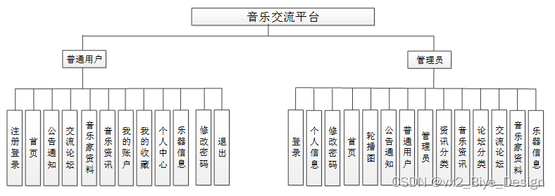 音乐交流平台整体的功能模块包括管理员+普通用户两个模块,实现了对音乐交流平台相关信息的查询管理,系统功能模块如图所示。