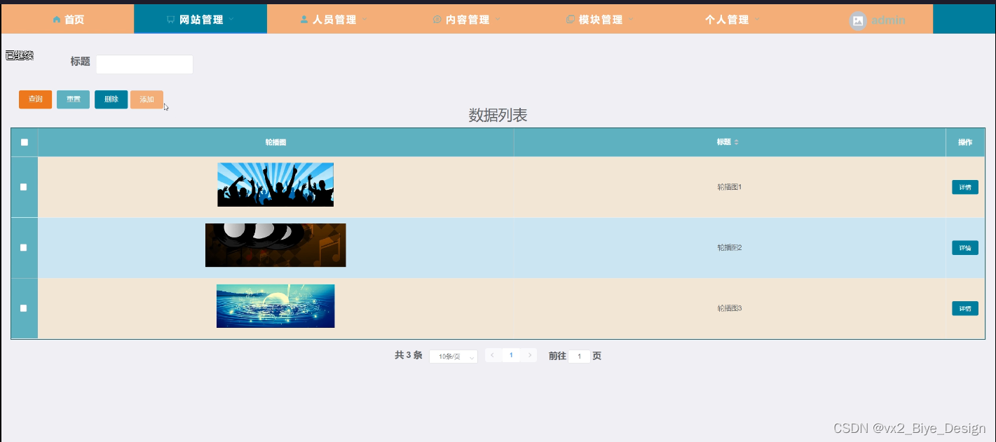 网站管理模块是对公告通知和轮播图的设置,只有管理员权限才能进行更新维护。界面如下图4.9所示。