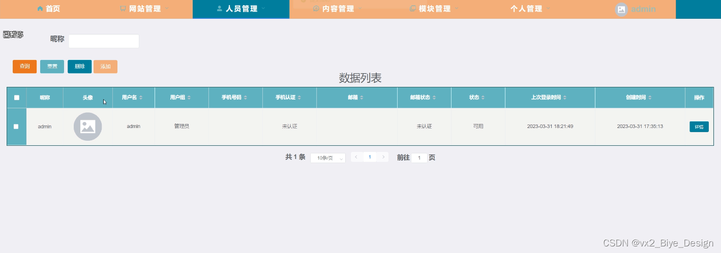 音乐交流平台中的管理员在“人员管理”这一菜单是中可以对注册的用户以及管理员人员进行管控。界面如下图4.10所示。