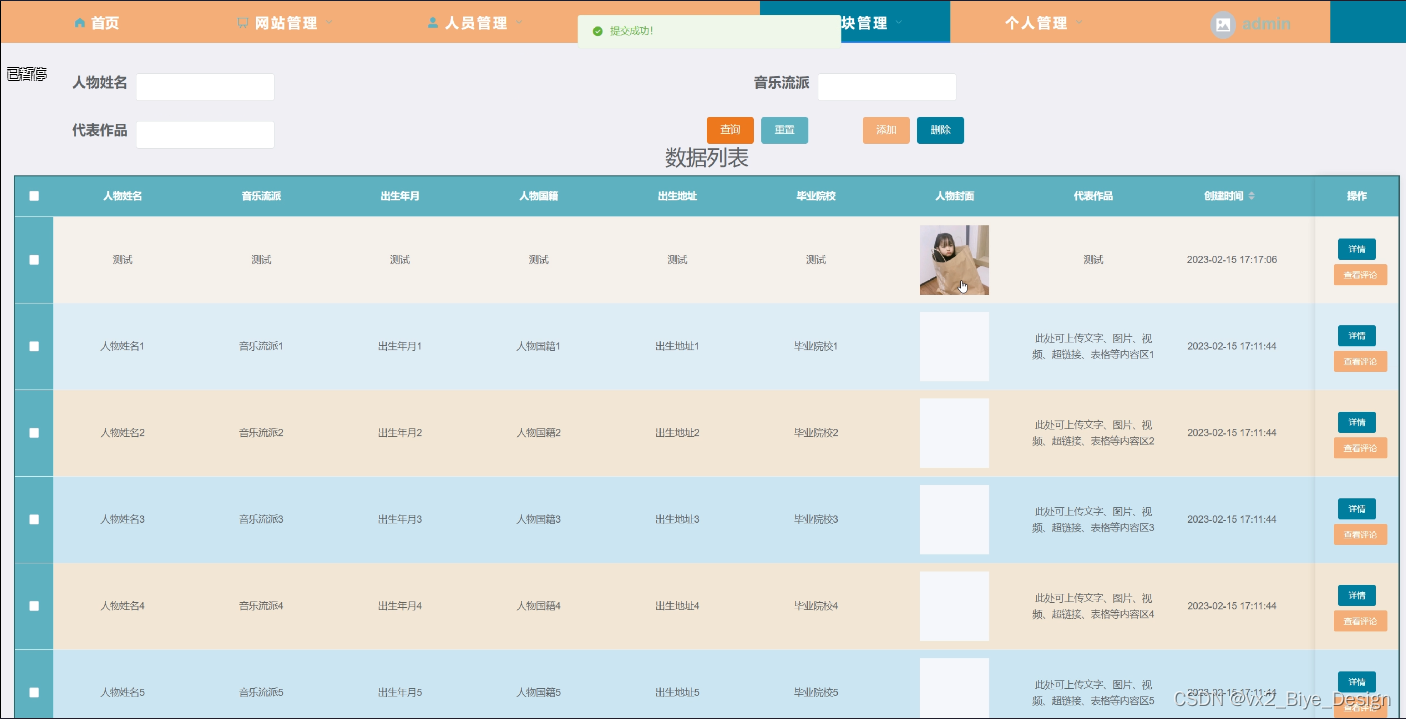 音乐交流平台中的管理人员在“模块管理”这一菜单下是可以对音乐交流平台内的音乐家资料、乐器信息进行管控的,其管理界面如下图4.12所示。