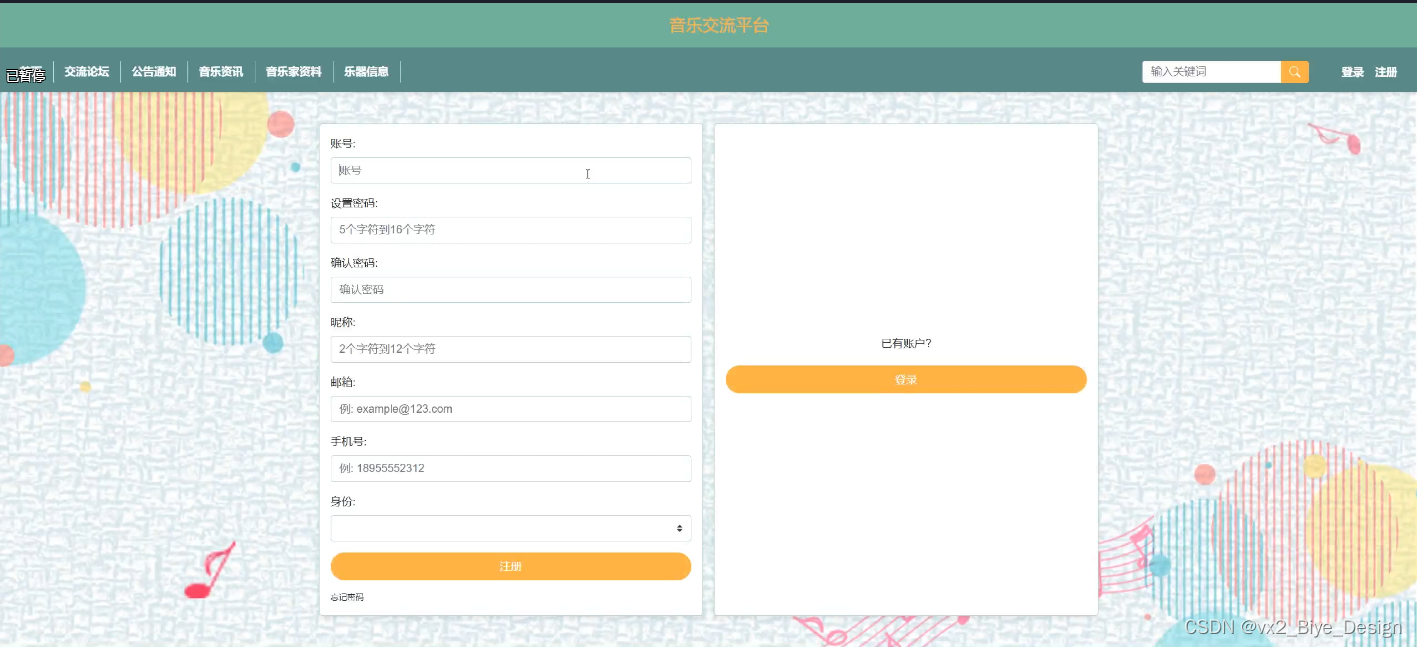不是音乐交流平台中用户的是可以在线进行注册的,当用户点击右上角“注册”按钮的时候,当填写上自己的账号+密码+确认密码+昵称+邮箱+手机号等信息后再点击“注册”按钮后将会先验证输入的有没有空数据,再次验证密码和确认密码是否是一样的,最后验证输入的账户名和数据库表中已经注册的账户名是否重复,只有都验证没问题后即可注册成功。其用户注册界面展示如下图4.2所示。