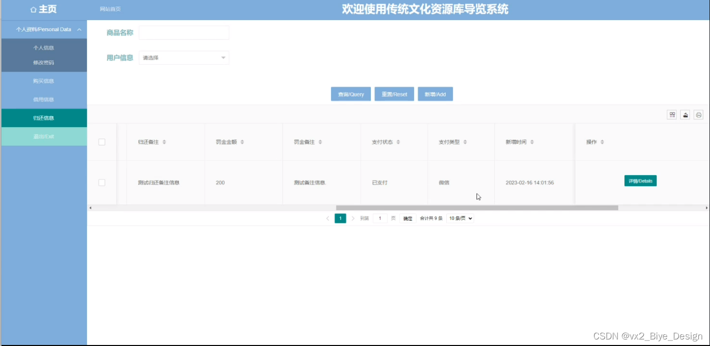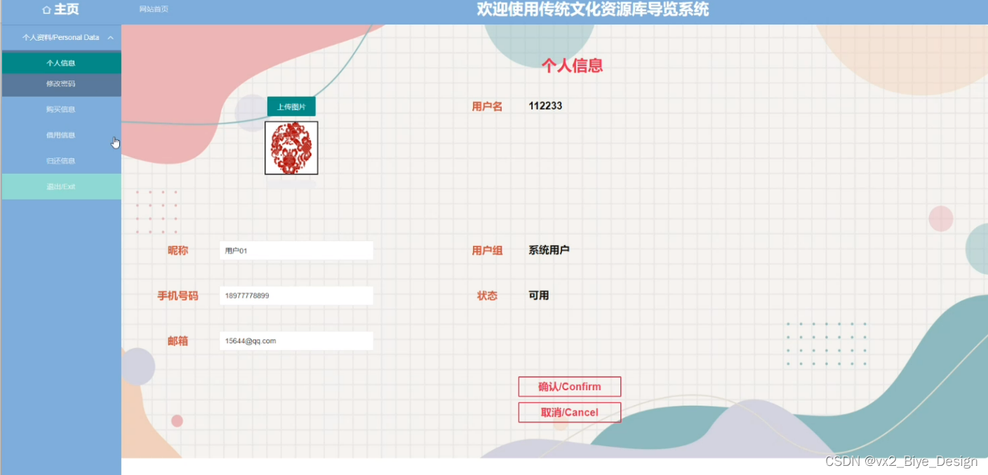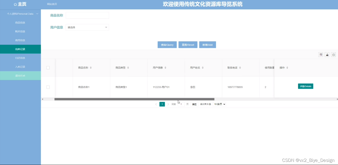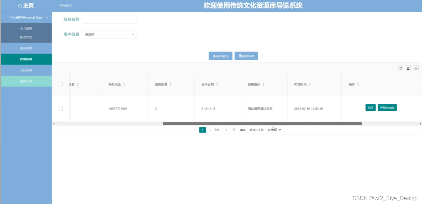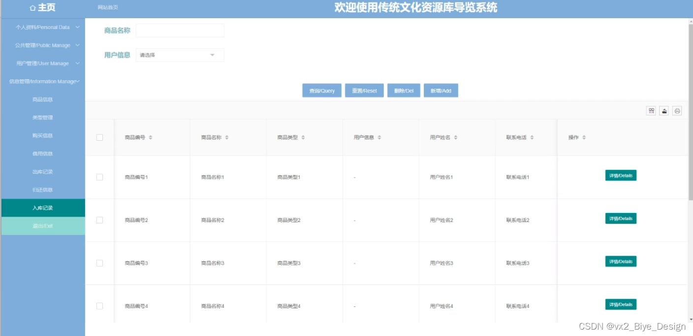 The system uses Java technology, uses browser interaction mode for all modules, selects MySQL as the system database, and selects My eclipse as the development tool to design the system. The main functional modules of the traditional culture resource library guide system have been basically realized. The system includes administrators, users, and staff. Administrators: home page, personal data (personal information, password modification), public management (broadcast map, announcement information), user management (pipeline, system users, and staff) Information management (commodity information, type management, purchase information, borrowing information, outbound record, return information, inbound record), user background; Home page, personal data (personal information, password modification), purchase information, borrowing information, return information, staff; Personal data (personal information, password modification), commodity information, purchase information, borrowing information, outbound information, return information, inbound records and other operations.