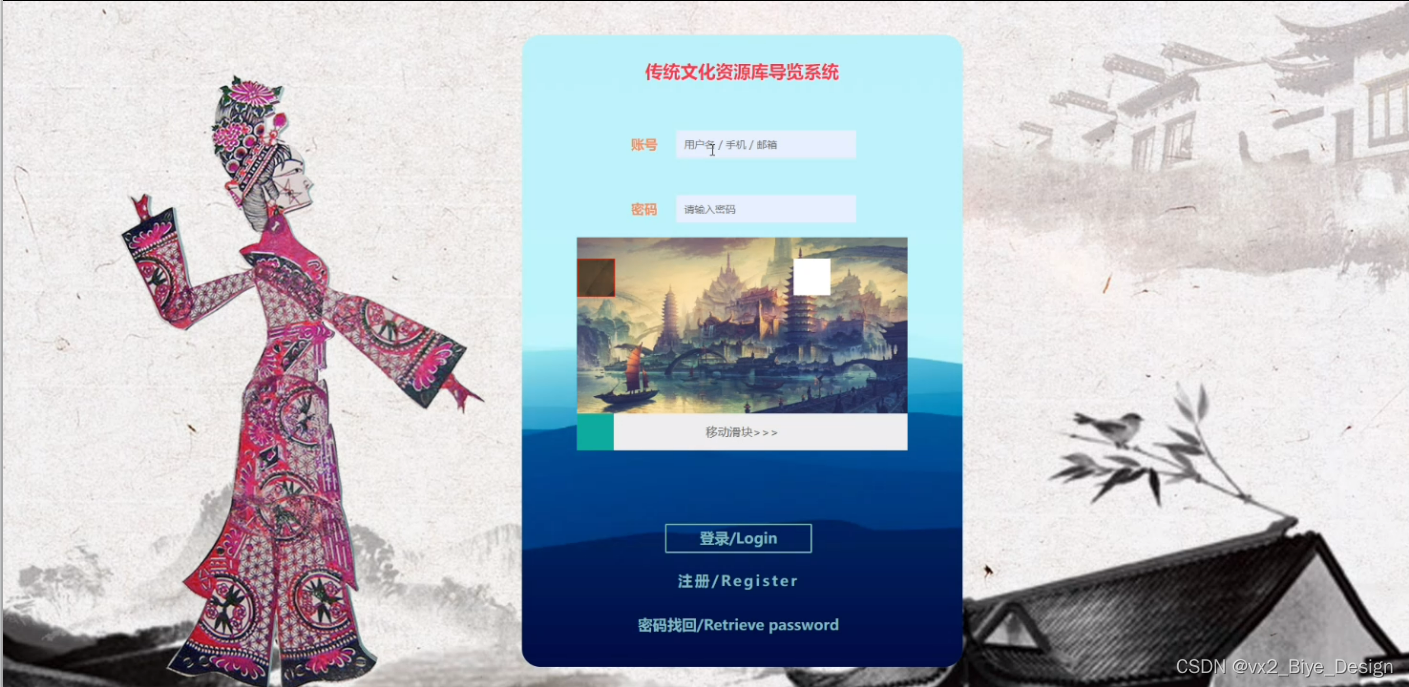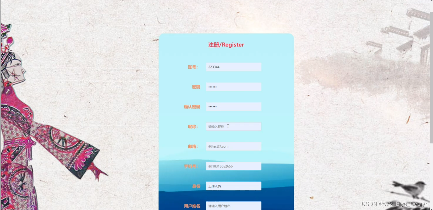 通过填写账号、密码、确认密码、昵称、邮箱、手机号、身份等信息进行注册,输入完成后选择注册、登陆即可进入传统文化资源库导览系统 ,如图5-8所示。