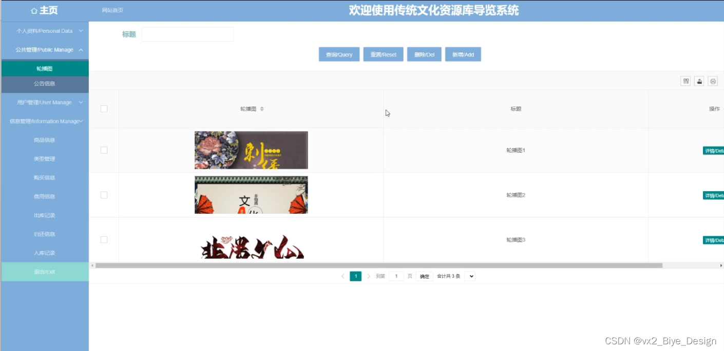 管理员通过公共管理页面查看轮播图/公共信息等进行上传图片进行添加、删除、修改以及查看并对整个系统进行维护等操作。程序效果图如下图5-7所示: