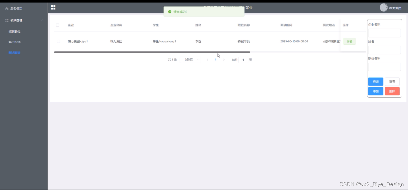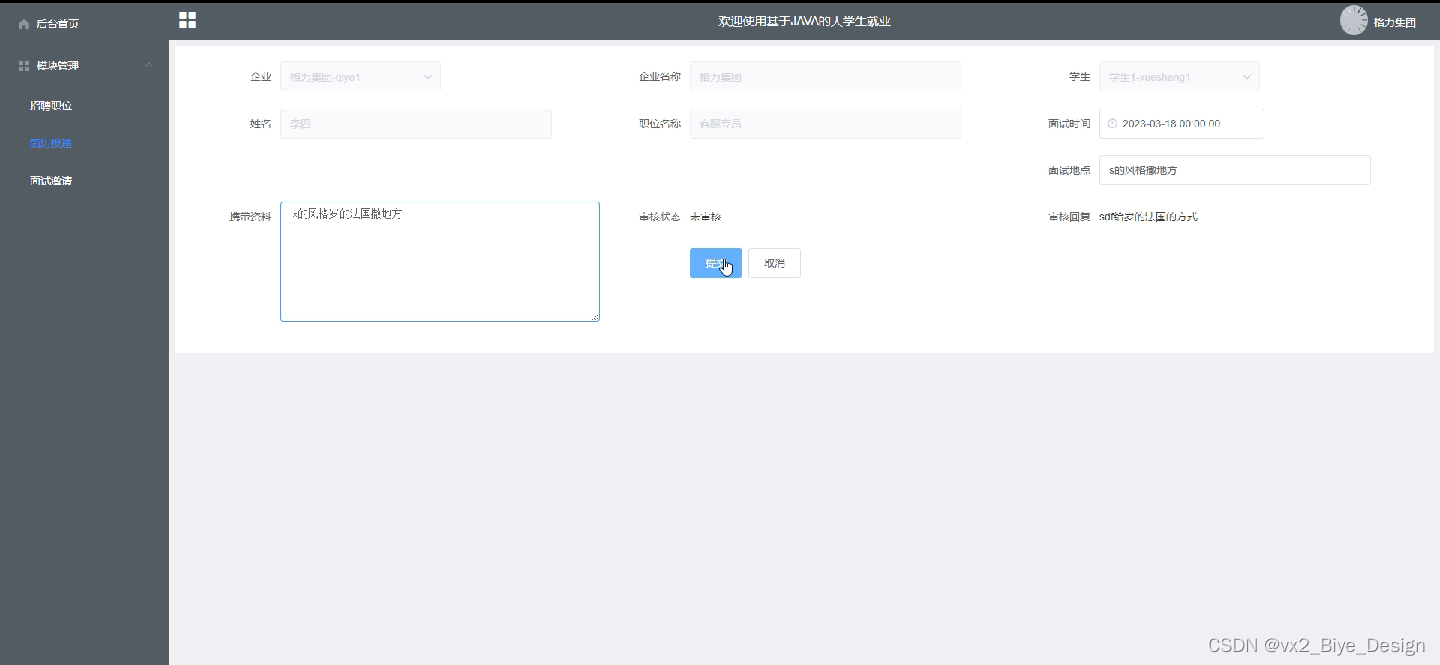 面试邀请:在面试邀请页面可查看学生的投递的简历详细信息,如:学生、姓名、职位名称等信息,并可根据详情进行编辑面试时间、面试地点等信息进行面试邀请,如图所示。