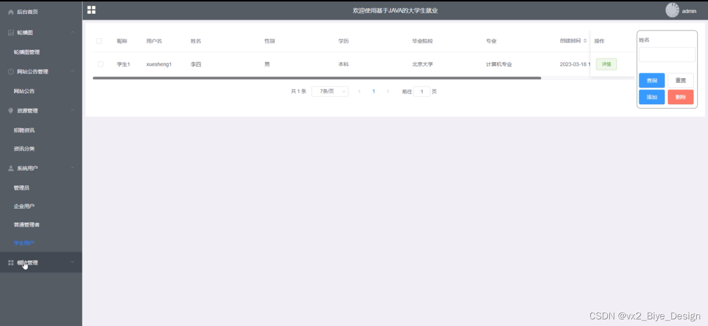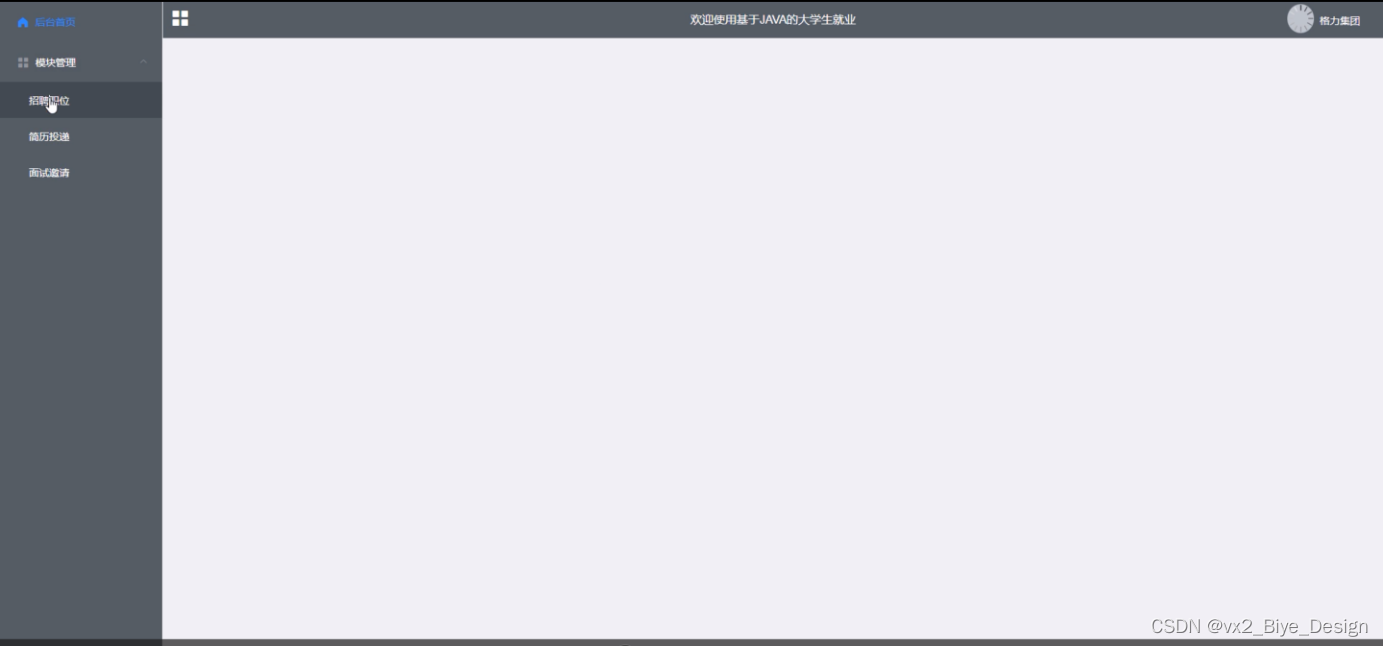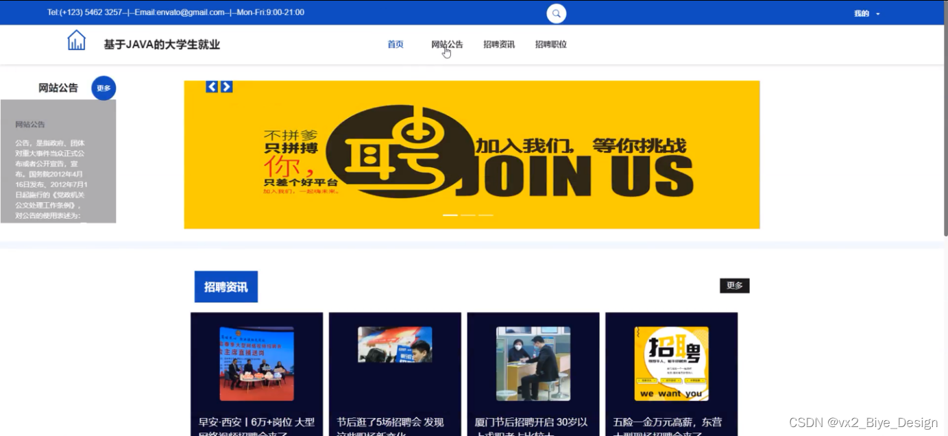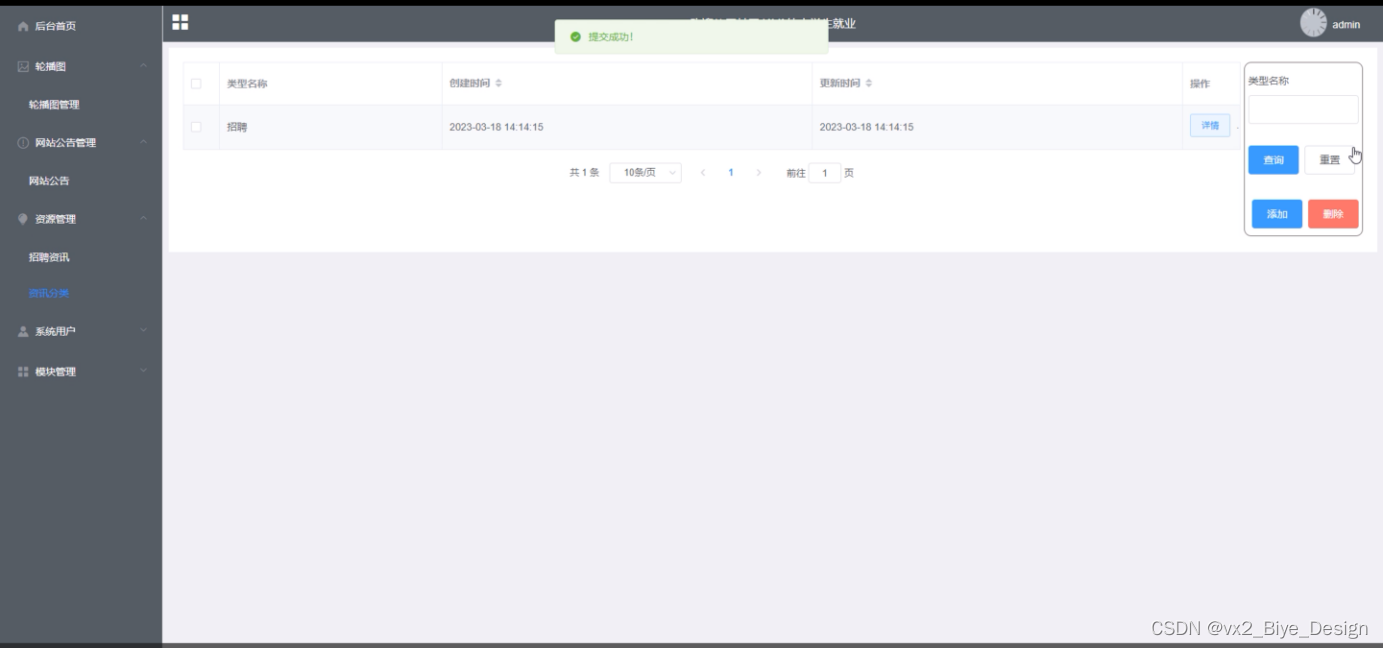 本系统设计的是一个大学生就业的网站,此网站使用户实现了不需出门就可以在电脑前进行网上查看后台首页、个人中心、轮播图管理、网站公告管理、资源管理(招聘资讯、资讯分类)、系统用户(管理员、学生用户、企业用户、普通管理者)、模块管理(职位分类、招聘职位、简历投递、面试邀请)等。不需亲临现场就可以在网站查看招聘信息和投递简历。