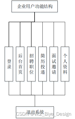 企业功能模块包括后台首页、模块管理(招聘职位、简历投递、面试邀请)。
