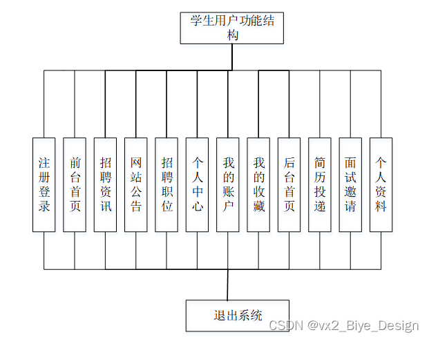 用户功能模块用户模块包括前台首页、网站公告、招聘资讯、我的(个人信息、我的账户、我的收藏),后台首页、模块管理(简历投递、面试邀请)。