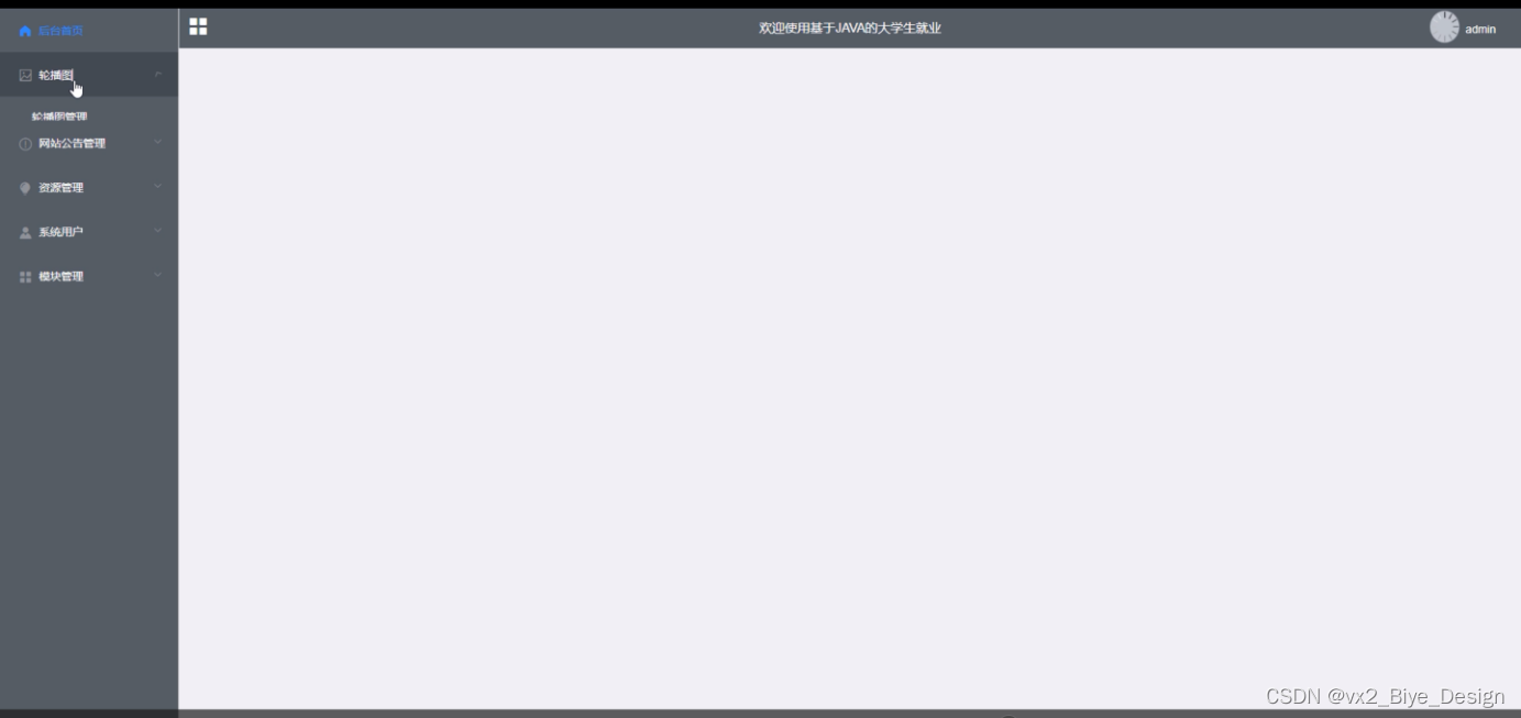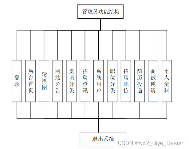 管理员功能模块包括:后台首页、个人中心、轮播图管理、网站公告管理、资源管理(招聘资讯、资讯分类)、系统用户(管理员、学生用户、企业用户、普通管理者)、模块管理(职位分类、招聘职位、简历投递、面试邀请)等功能模块。