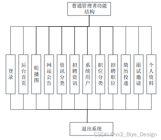 普通管理者功能模块:后台首页、个人中心、轮播图管理、网站公告管理、资源管理(招聘资讯、资讯分类)、系统用户(学生用户、企业用户)、模块管理(职位分类、招聘职位、简历投递、面试邀请)等功能模块
