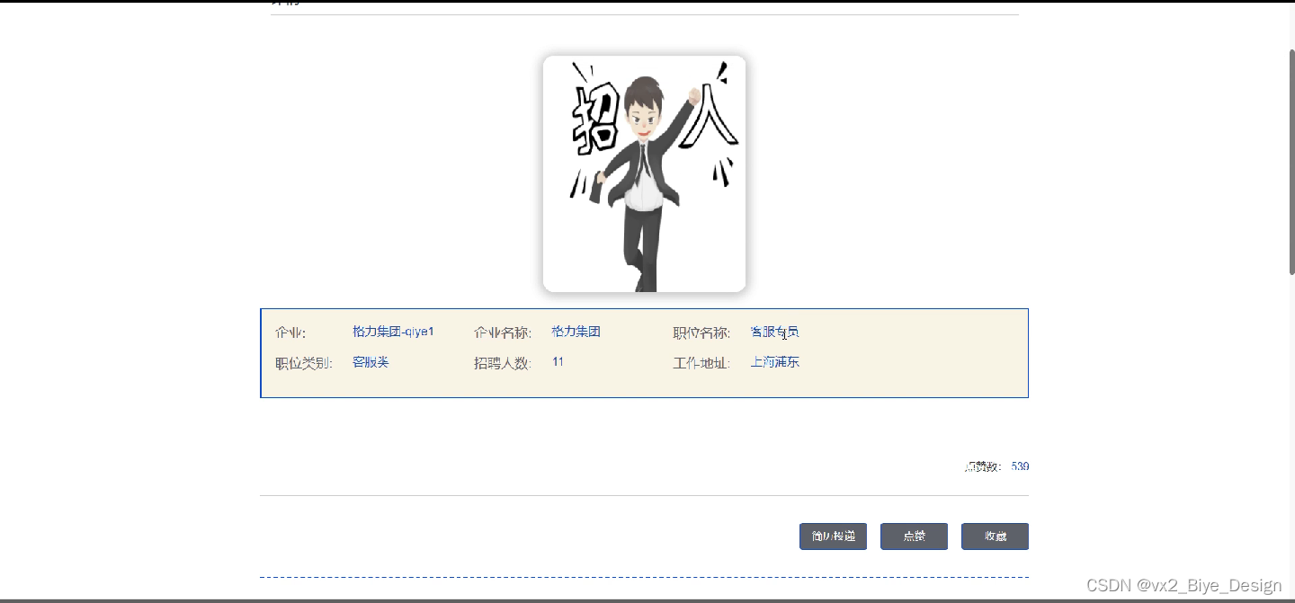 招聘职位:学生用户在招聘职位搜索企业名称、职位名称、职位类型或下拉搜索进行查看招聘详情,如企业、企业名称、职位名称、职位类别、招聘人数、工作地点等详细信息,可进行点赞、收藏或编辑简历进行投递等操作,如图5-6所示。