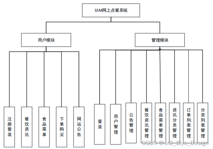 (3)确定好系统使用的技术,进行在线确认系统所划分的用户角色,并且根据用户角色划分确定所要设计的功能模块,对网上点餐系统的设计主要划分别为管理员和用户角色,并所使用的功能模块也相应不同,但是系统的数据库实现的内容是交互的,用户可以随时根据自己的需求进行线上菜品预订,对于系统工作人员可以根据自己的分管内容进行在线信息的处理及操作,管理员获取到所有用户的详细数据信息,并根据需求进行第一时间处理解决。