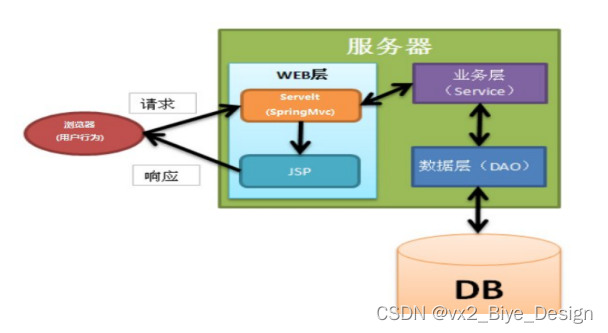 页面发送请求给控制器,控制器调用业务层处理逻辑,逻辑层向持久层发送请求,持久层与数据库交互,后将结果返回给业务层,业务层将处理逻辑发送给控制器,控制器再调用视图展现数据。