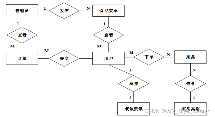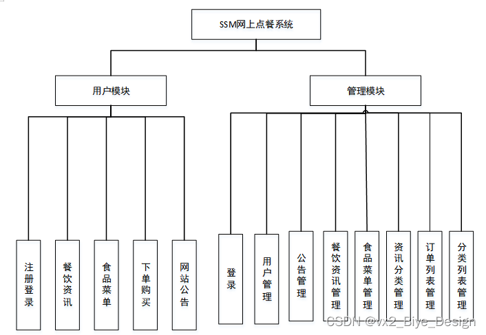 (3)确定好系统使用的技术,进行在线确认系统所划分的用户角色,并且根据用户角色划分确定所要设计的功能模块,对网上点餐系统的设计主要划分别为管理员和用户角色,并所使用的功能模块也相应不同,但是系统的数据库实现的内容是交互的,用户可以随时根据自己的需求进行线上菜品预订,对于系统工作人员可以根据自己的分管内容进行在线信息的处理及操作,管理员获取到所有用户的详细数据信息,并根据需求进行第一时间处理解决。