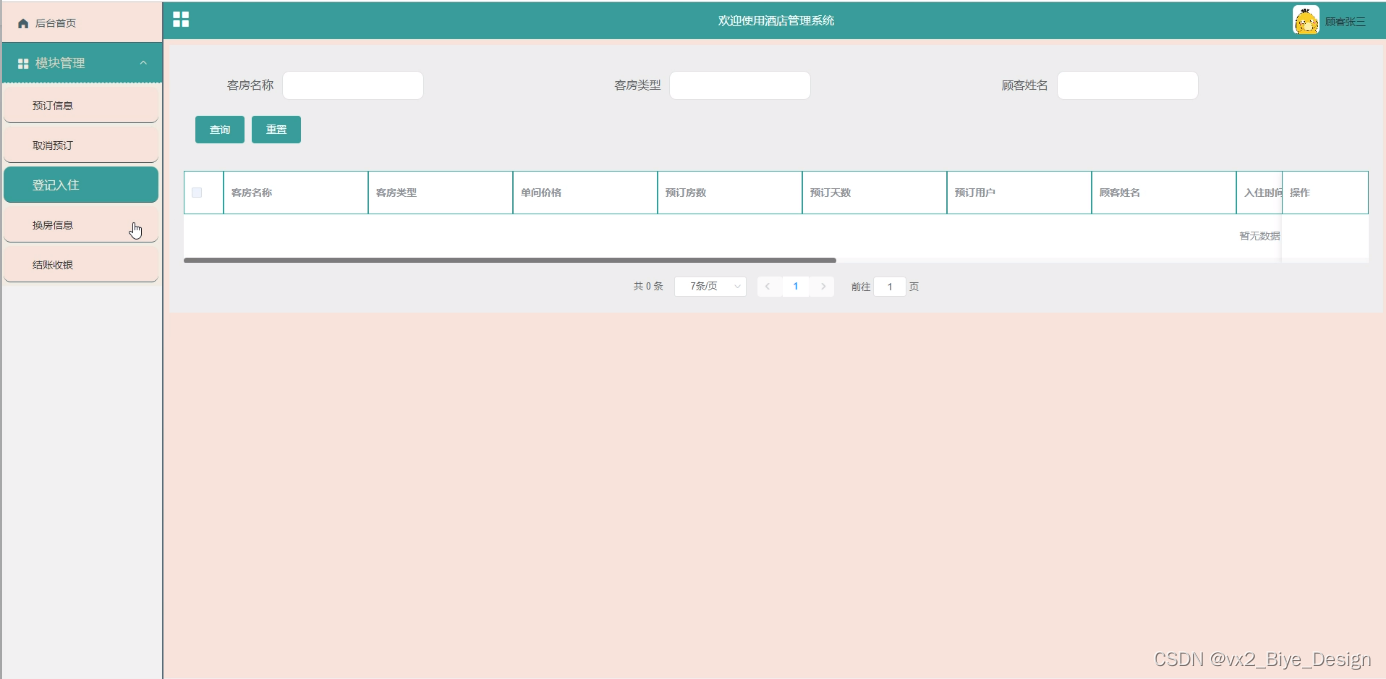顾客登录进入首页管理可以查看后台首页、模块管理(预订信息、取消预订、登记入住、换房信息、结账收银)等内容,如图5-6所示。