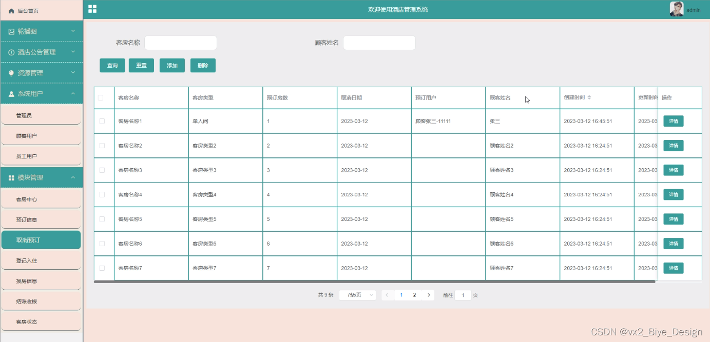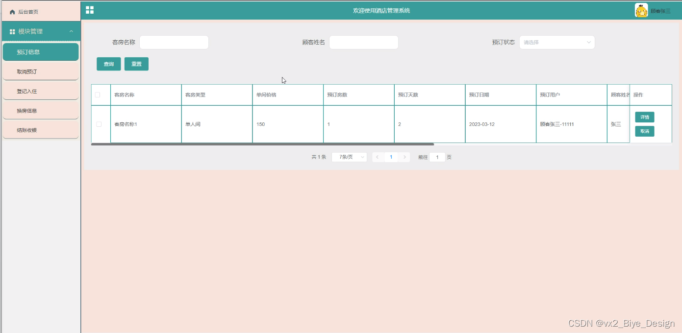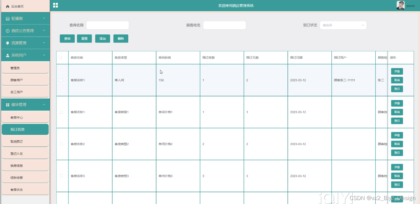 预订信息管理,在预订信息管理添加页面可以查看到客房名称、预订天数、顾客姓名、客房类型、预订日期、预订备注、单间价格、预订房数、预订用户、预订状态、预订回复等信息,并可根据需要进行查询,取消、登记,删除或查看详细内容等操作,如图5-3所示。