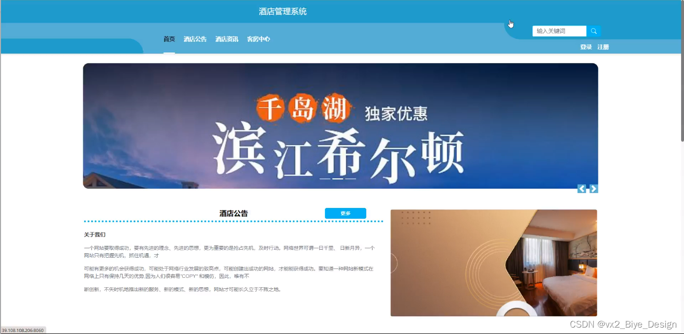 酒店管理系统首页功能界面图,功能分为:首页、酒店公告、酒店资讯、客房中心、后台管理;如下图所示:
