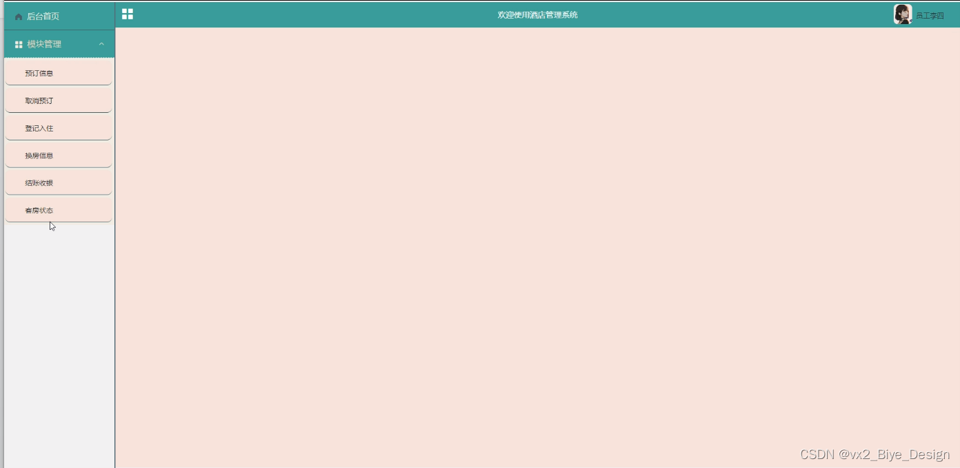 员工登录进入首页管理可以查看后台首页、模块管理(预订信息、取消预订、登记入住、换房信息、结账收银、客房状态)等内容,如图5-11所示。
