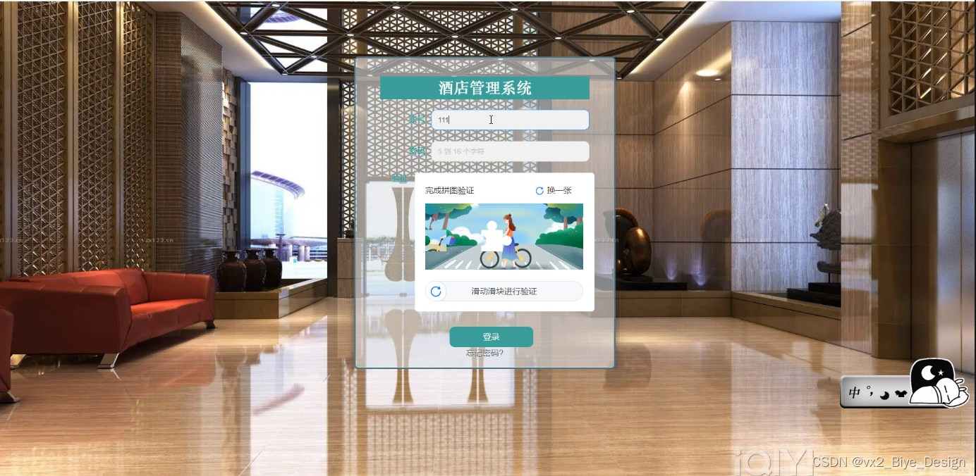 用户登录,用户通过填写用户名、密码、权限、验证码等信息,输入完成后选择登录即可进入酒店管理系统,如图5-8所示。