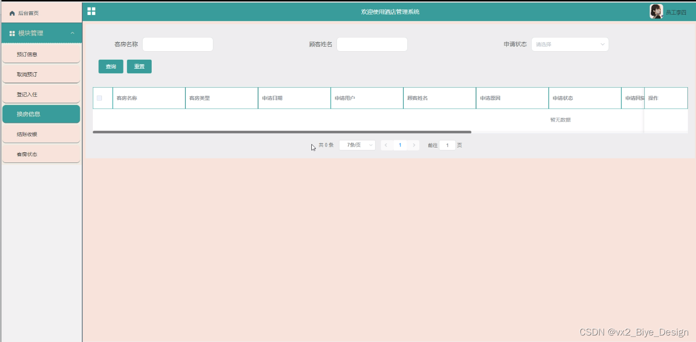 换房信息管理,在换房信息管理页面可以客房名称、客房类型、申请日期、申请用户、顾客姓名、申请原因、申请状态、申请回复等信息,还可在该页面进行查询、编辑删除详情等操作,如图5-12所示: