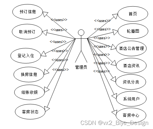 (1)功能要求:可以管理系统首页、轮播图(轮播图管理)、酒店公告管理(酒店公告)、资源管理(酒店资讯、资讯分类)、系统用户(管理员、顾客用户、员工用户)、模块管理(客房中心、预订信息、取消预订、登记入住、换房信息、结账收银、客房状态)等功能模块。