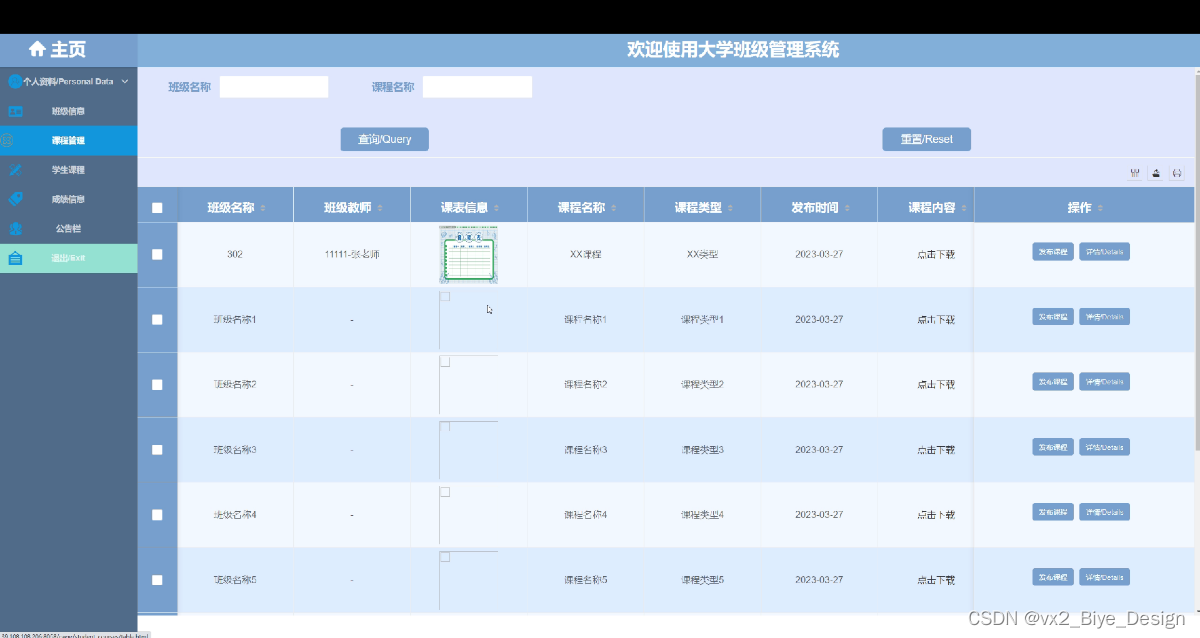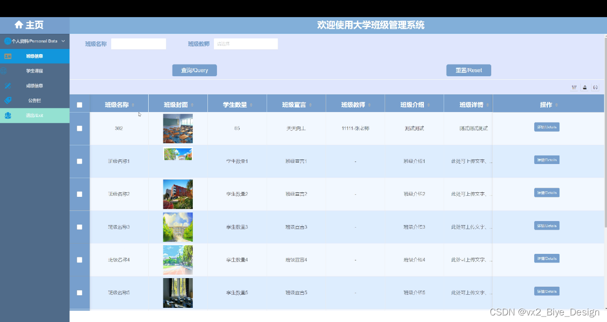 班级信息管理,在此页面图中可以查看信息:班级名称,班级封面,学生数量,班级宣言,教师等内容,还可在此页面对进行重置,删除,新增,发布课程等操作,如图5-6所示: