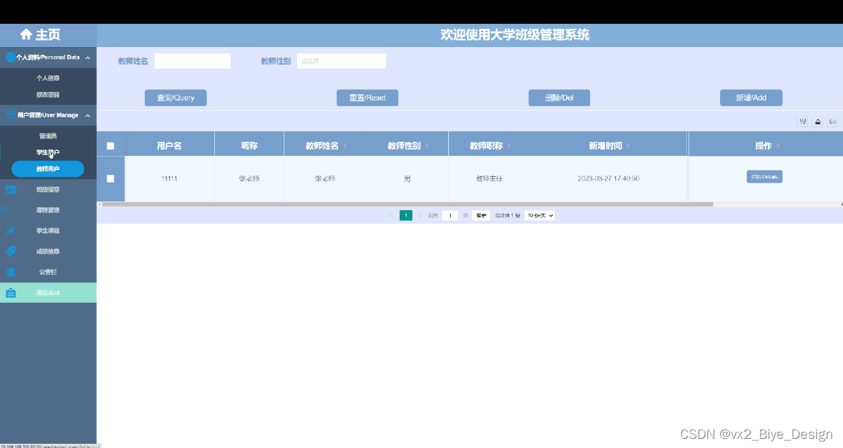 用户管理-教师用户,在此界面图可添加教师用户信息内容:用户名,昵称,教师姓名,性别,职称等信息,还可在此页面对进行重置,删除,新增等操作,如图5-4。