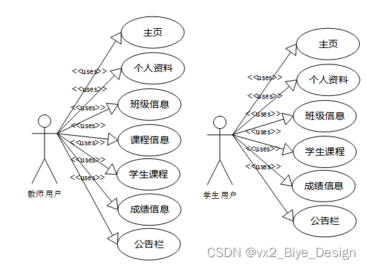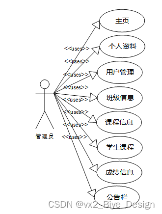 系统设计的目的是分析系统包括的所有功能结构,为开发人员设计开发和实现系统做好准备工作。经过前期的需求调查、分析和整理之后,确定的总体需求主要包括多个模块,分别是:主页,个人资料(个人信息,修改密码),用户管理(管理员,学生用户,教师用户),班级信息,课程信息,学生课程,成绩信息,公告栏。系统整体角色分为三个部分,一是管理员、二是教师用户、最后是学生用户。权限分布也是很明显,管理员用户是在除去浏览信息之外还具有查询和管理用户管理(管理员,学生用户,教师用户),班级信息,课程信息,学生课程,成绩信息,公告栏等权限;管理员是最高权限拥有者。