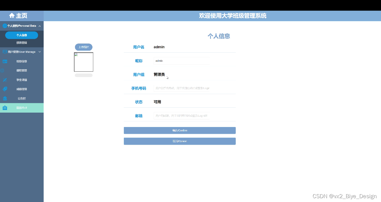 管理员登录大学班级管理系统,管理员后台功能为:主页,个人资料(个人信息,修改密码),用户管理(管理员,学生用户,教师用户),班级信息,课程信息,学生课程,成绩信息,公告栏等功能,如下图所示: