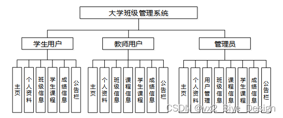 大学班级管理系统在对需求做解析后,整个系统主要分为管理员和教师用户,学生用户,每个模块下的分支功能不一样。管理员模块包括:主页,个人资料(个人信息,修改密码),用户管理(管理员,学生用户,教师用户),班级信息,课程信息,学生课程,成绩信息,公告栏;教师用户模块包括:主页,个人资料(个人信息,修改密码),班级信息,课程信息,学生课程,成绩信息,公告栏等模块。学生用户模块包括:主页,个人资料(个人信息,修改密码),班级信息,学生课程,成绩信息,公告栏等模块。