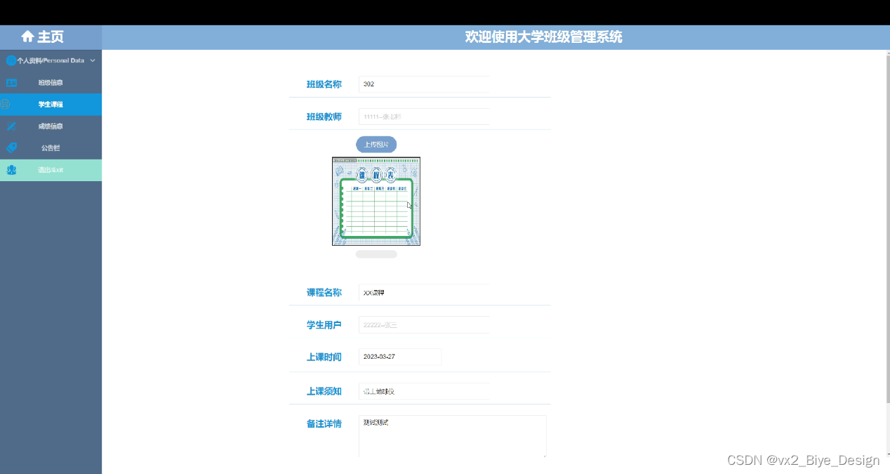 教师登录大学班级管理系统,后台功能为:主页,个人资料(个人信息,修改密码),班级信息,课程信息,学生课程,成绩信息,公告栏等功能,如下图所示: