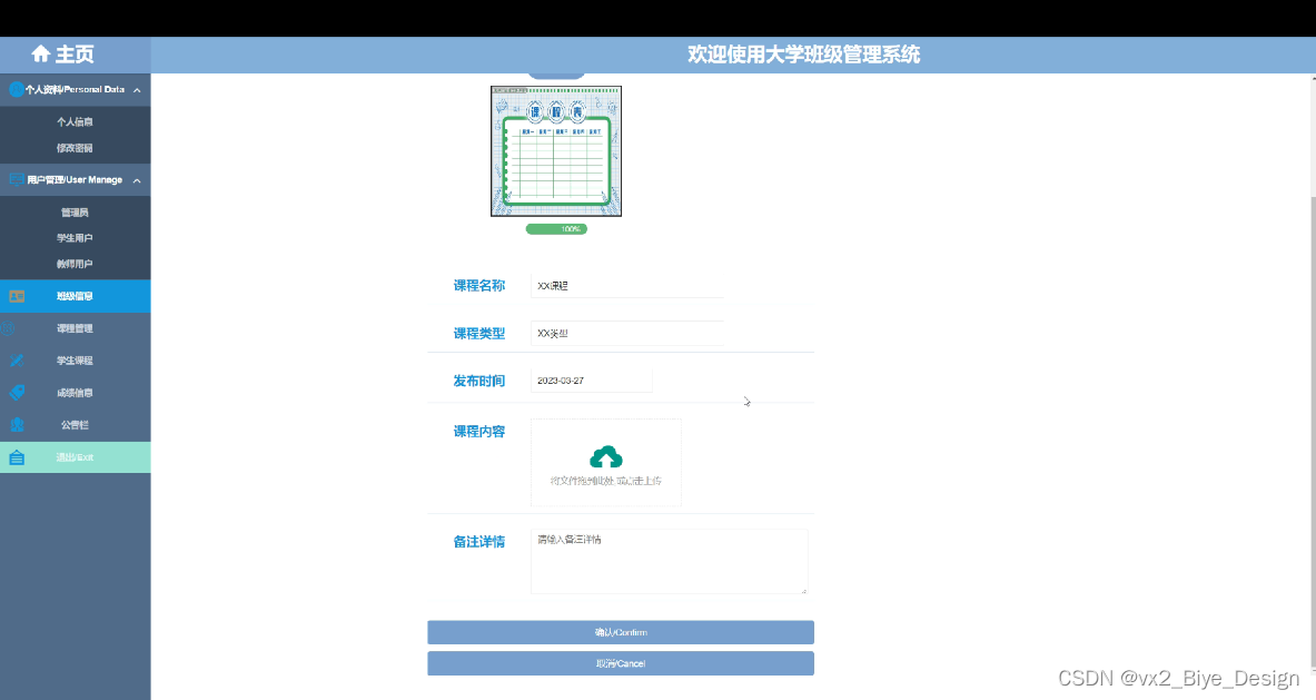 课程管理,在此管理页面可查询管理员发布的课程,并进行确认以及向学生发布等操作,如下图所示。