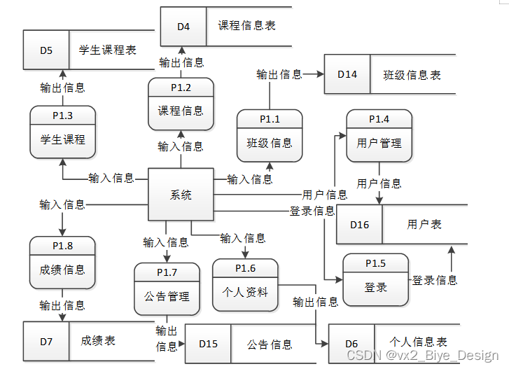 二层数据流程是对一层数据流层图中填写登录信息、用户功能的细化。即:填写登录信息细化为填制信息、后台审核,用户功能细化为用户管理,班级信息,课程信息,学生课程,成绩信息等操作。
