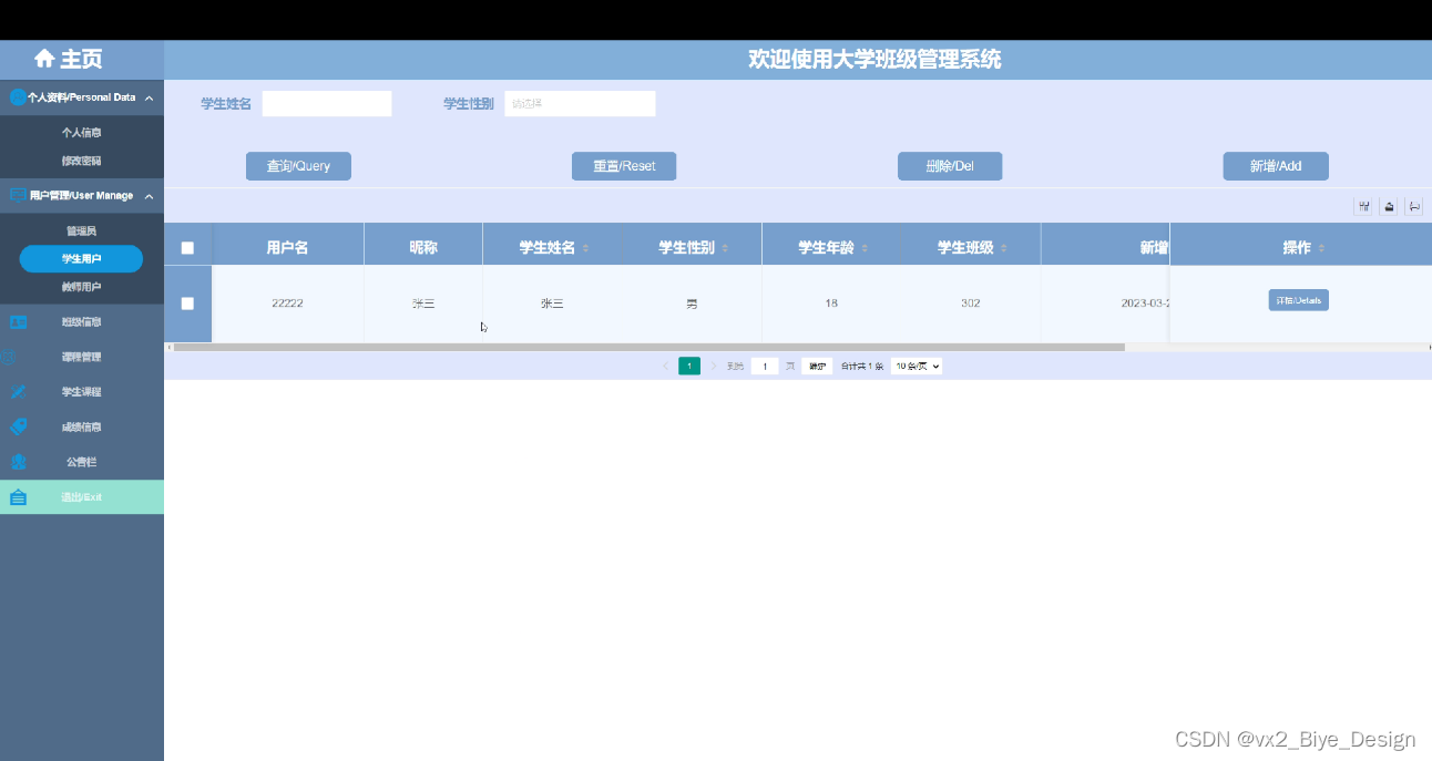 用户管理-学生用户,在此界面图可添加从学生用户信息内容:用户名,昵称,学生姓名,性别,年龄,班级等信息,还可在此页面对进行重置,删除,新增等操作,如图5-5所示: