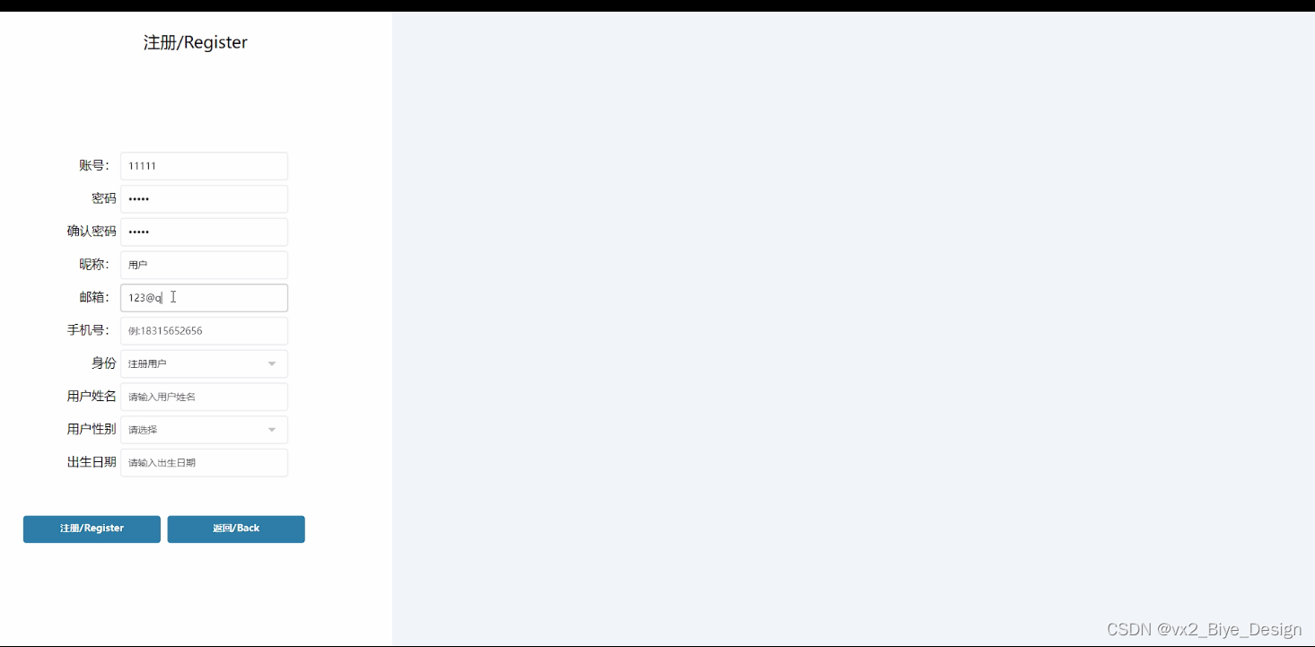 | 后置条件 | 用户填写相关注册数据并且要注册的账号不存在与系统中 |