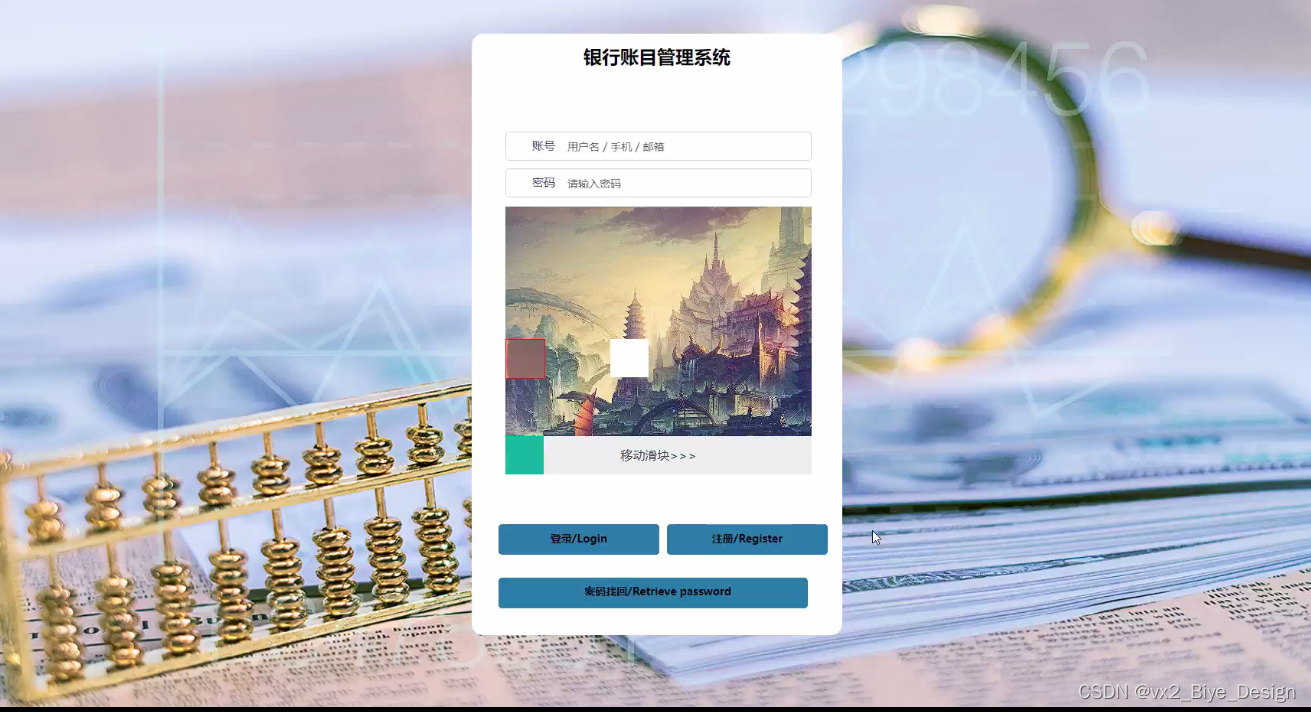 本系统的前端界面涉及的技术主要有JSP, HTML,jQuery等等,通过这些技术可以实现前端页面的美观和动态效果使之符合广大群众的审美观,后台主要使用的技术主要有Java编程语言,MySQL数据库,SSM框架和Ajax异步交互,根据Ajax异步模式的银行账目管理系统解决了传统管理方式所带来的人力、物力和时间上的虚耗和交流深度的限定,这让交流的过程更快捷、准确、便利,同时完成银行账目管理系统的基本功能:主页、个人资料、用户管理(管理员、注册用户)账户信息、存款信息、支出信息、透支信息、贷款信息、透支还款、贷款还款。
